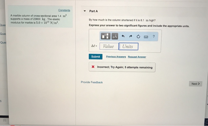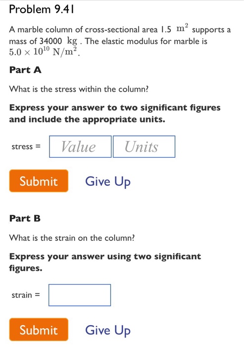 A marble column of cross sectional area 0 80 m 2 supports a mass of 32000 kg.